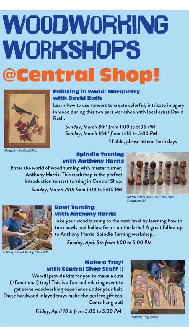 Each semester, transfer students and new faculty/ staff go through a two-hour Central Shop Orientation. Included is a safety overview and tour of the shop’s resources, followed by introductory demos over the table saws, miter saws, bandsaws, and drill presses.